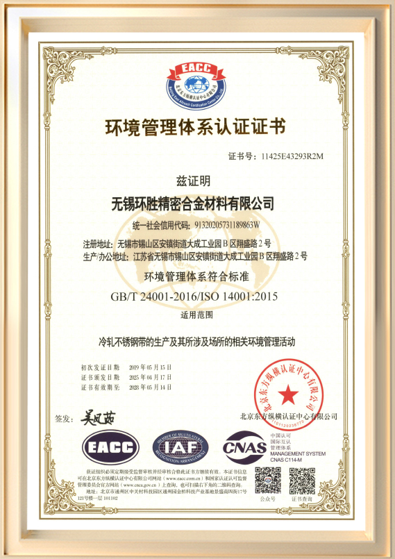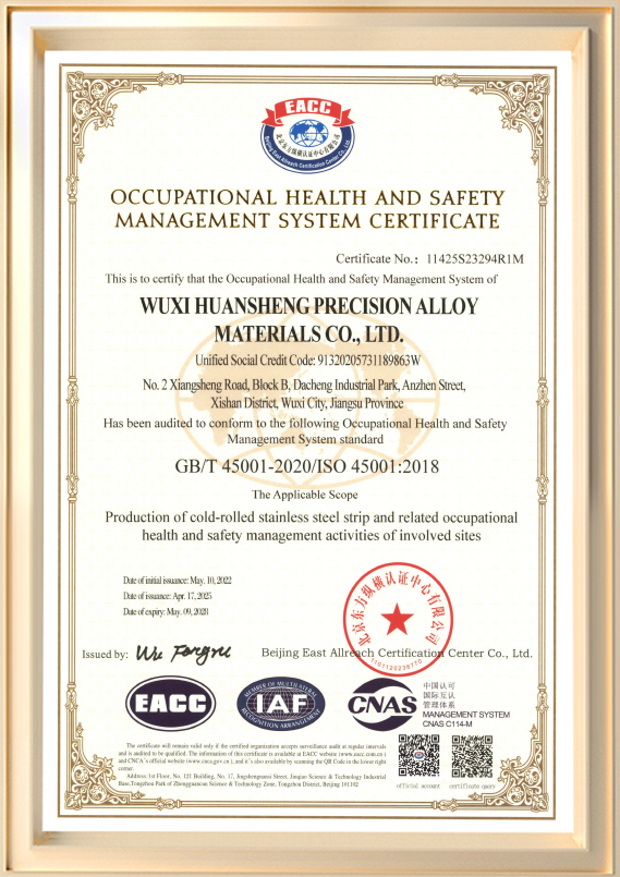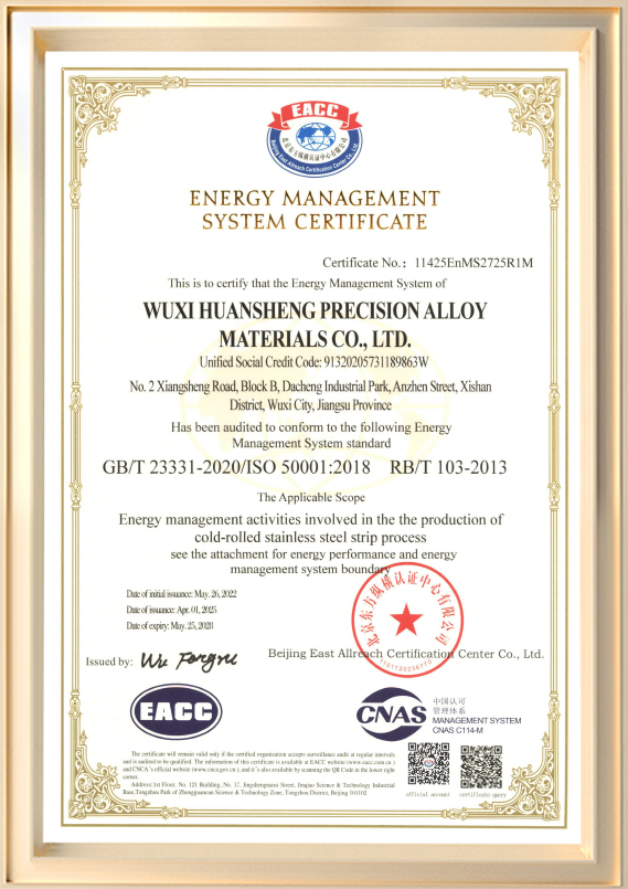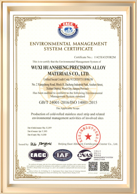Wuxi Huansheng Precision Alloy Materials Co., Ltd. (ehemals Wuxi Huansheng Metal Produkte Co., Ltd.) wurde 2001 gegründet und ist ein spezialisierter Hersteller, der sich mit der Forschung, Entwicklung und Produktion von kaltgewalzten Edelstahlbändern beschäftigt. Das Unternehmen verfügt über ein eingetragenes Kapital von 60 Millionen RMB und eine Betriebsfläche von rund 45.990 Quadratmetern mit einer jährlichen Produktionskapazität von bis zu 72.000 Tonnen. Unsere Produktdicke reicht von 0,03 mm bis 3,0 mm bei einer maximalen Breite von 650 mm. Unterstützt durch ein starkes technisches Team und ein modernes Managementsystem hat das Unternehmen mehrere internationale Zertifizierungen erhalten, darunter ISO 9001, ISO/TS 16949 und ISO 14001.